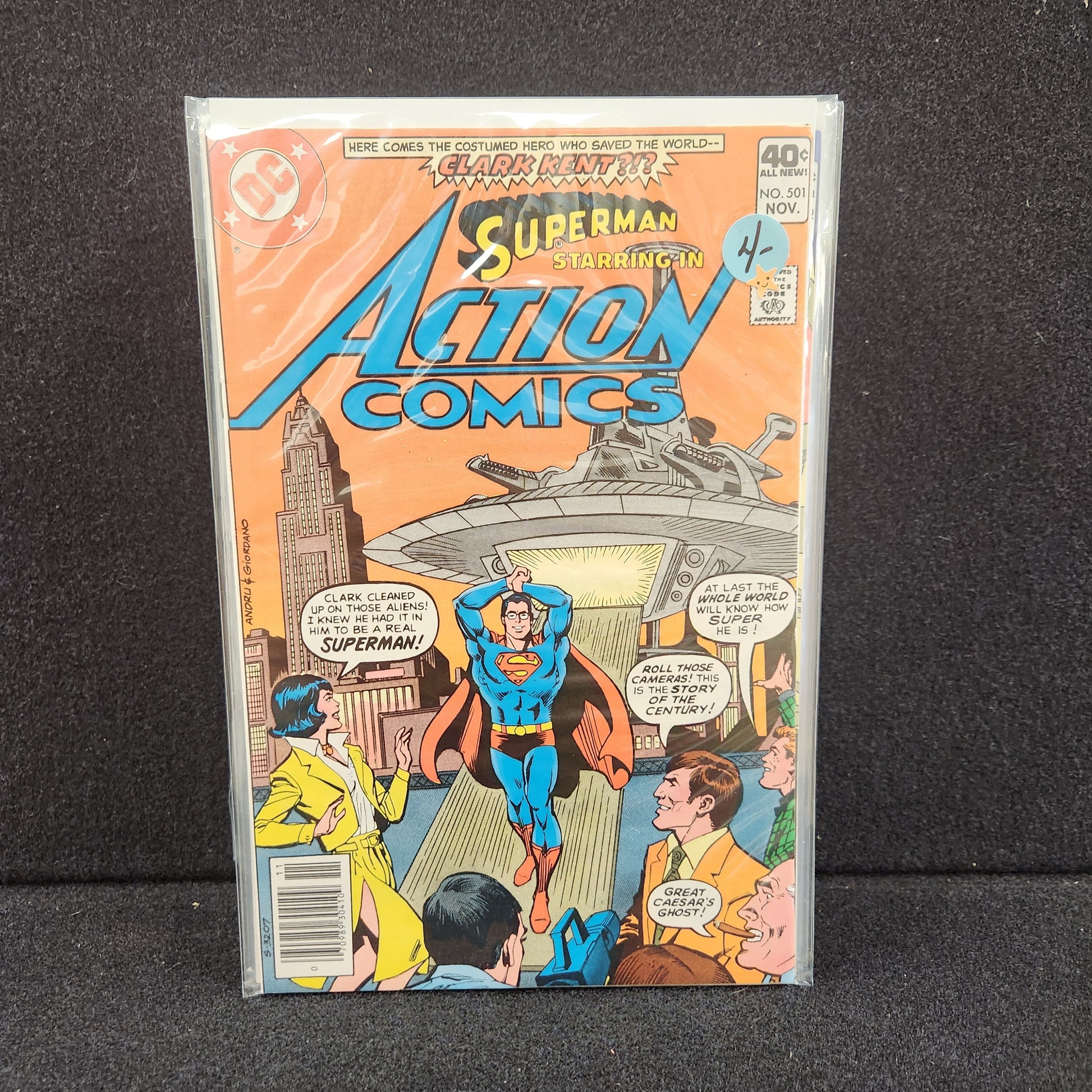 Action Comics #500 (Oct 1979). A giant-sized 500th anniversary issue celebrating "The Life Story of Superman!" A landmark issue with a wraparound cover by Andru and Giordano.