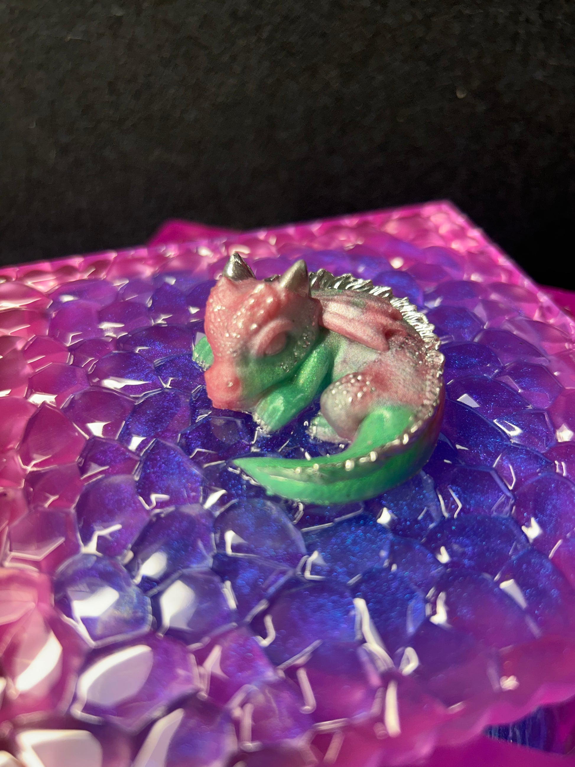 4.5x4.5x2.5" pink, purple, and clear acrylic jewelry/keepsake box designed to look like dragon scales. Features a baby dragon figure on top with teal, pink, and silver accents.