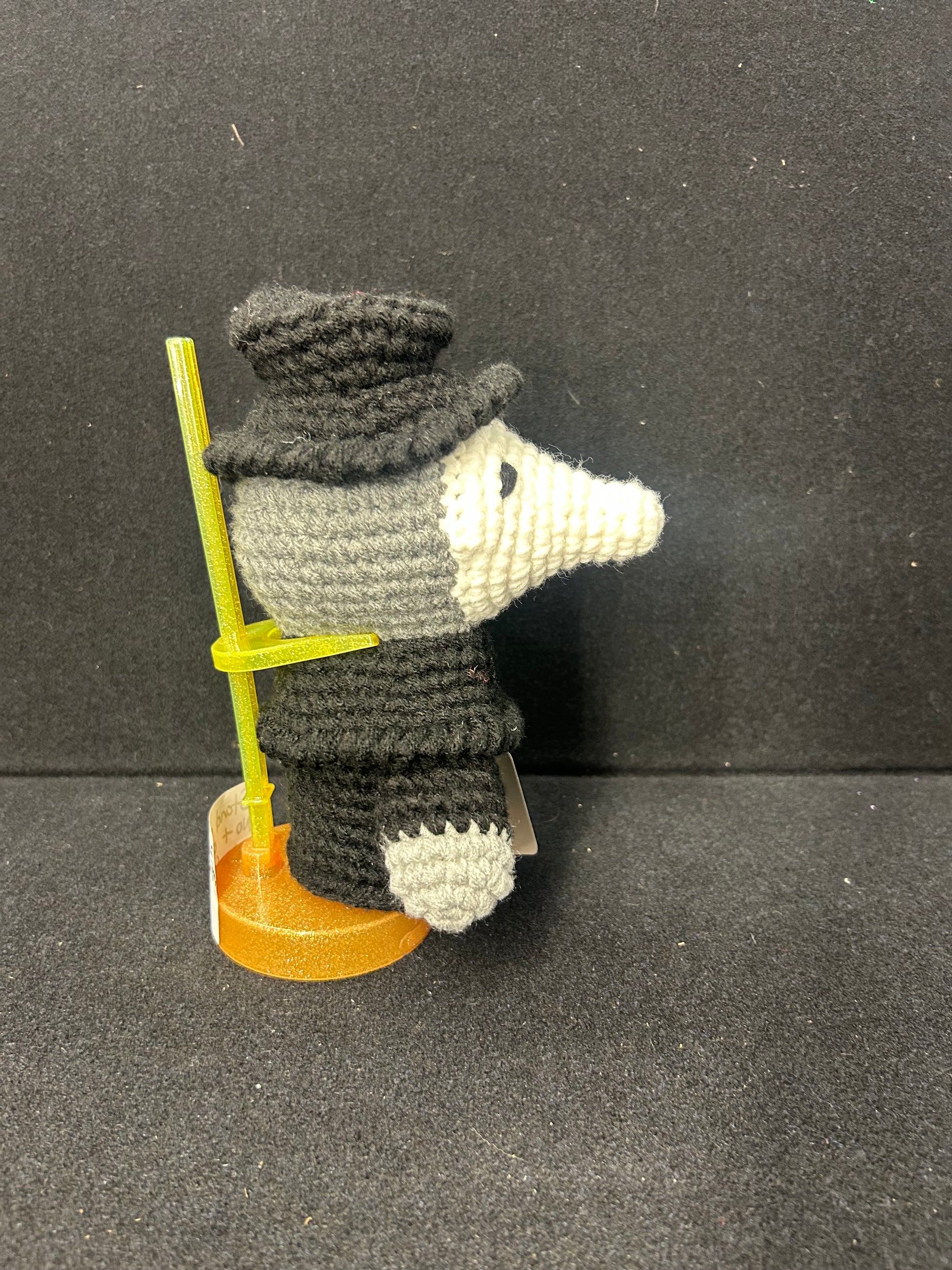 Unique handmade crochet plague doctor featuring classic hat and mask details. Soft and collectible design.
